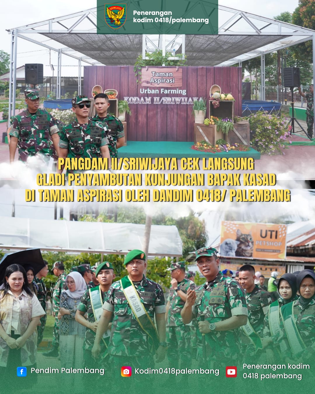 WARTAINSUMSEL.COM | PALEMBANG – Komandan Kodim 0418/Palembang Letkol Arh Erik Novianto, S.Sos mendampingi Pangdam II/Sriwijaya Mayjen TNI Ujang Darwis, M.D.A. dalam kegiatan pengecekan kesiapan Taman Aspirasi yang berlokasi di Makodim 0418/Palembang, Senin (03/11/2025).