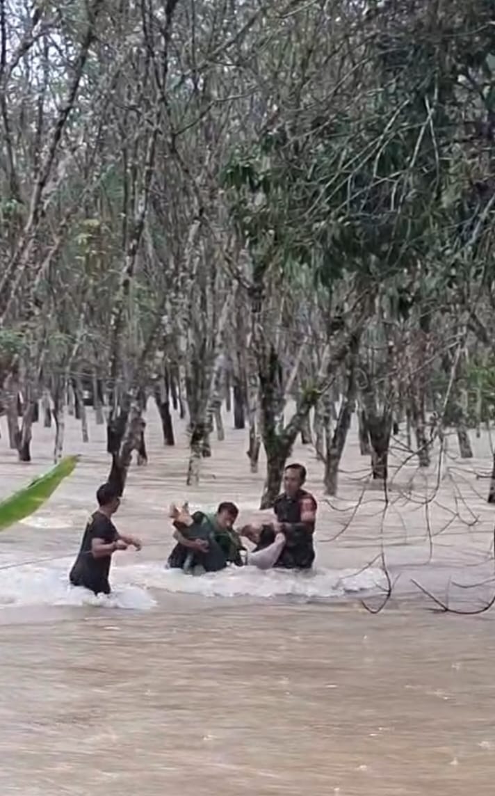 Wartainsumsel.com | OKU Timur – Babinsa Desa Karang Jadi Koramil 403-04/Belitang, Serda Iwan, bersama Bhabinkamtibmas setempat bergerak cepat evakuasi warga yang terseret arus banjir, Kamis (8/1/2026).