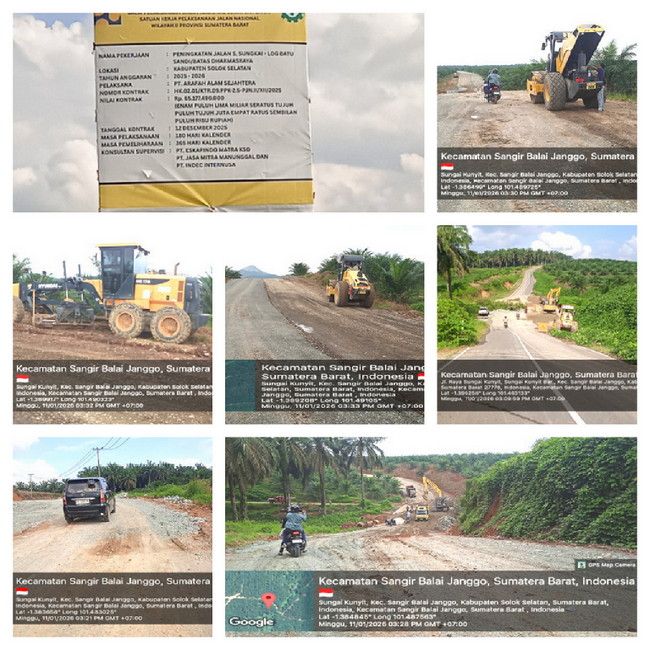 Tim media mendapati plang resmi proyek Kementerian PU berdiri di tengah kawasan perkebunan dan hutan, bertuliskan: Peningkatan Jalan S. Sungkai – Log Batu Sandi/Batas Dharmasraya. Nilai Kontrak: Rp 65.177.490.000,00. Pelaksana: PT Arafah Alam Sejahtera. Sumber Dana: APBN 2025–2026. Balai: BP2JN Wilayah II Sumatera Barat