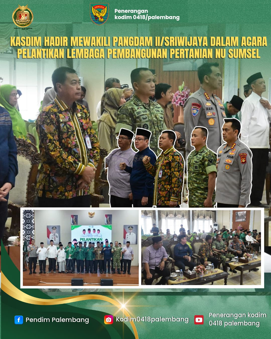 Kehadiran Kasdim 0418/Palembang tersebut sekaligus mewakili Pangdam II/Sriwijaya dalam acara pelantikan pengurus LPP NU Sumsel yang berlangsung khidmat. Kegiatan ini turut dihadiri unsur Forkopimda Provinsi Sumsel, diantaranya Kapolda Sumsel yang diwakili Dirbinmas Kombes Hari Purnomo, S.Ik, S.H., M.Han, tokoh agama, serta pengurus PWNU Sumatera Selatan.