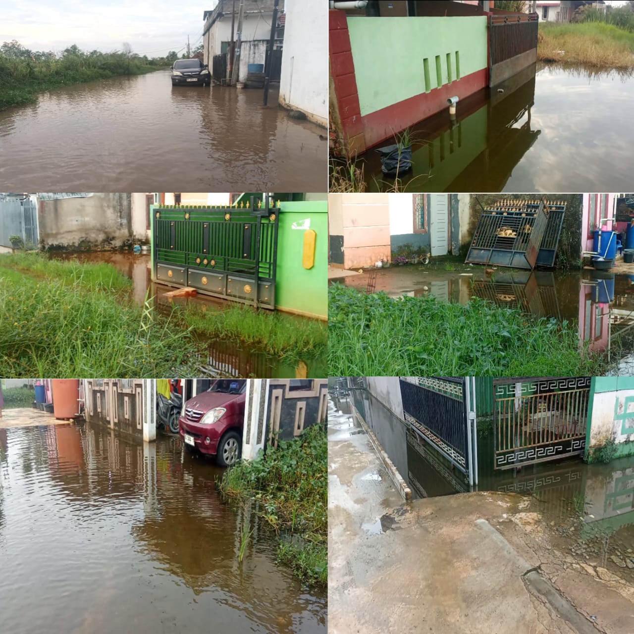 Di Perumahan Meritai Anggrek Indah, air mulai masuk ke jalan utama dan halaman rumah beberapa saat setelah hujan deras turun. Salah satu warga, Hj Doni, menyebut banjir kerap tinggi karena tidak adanya aliran pembuangan.