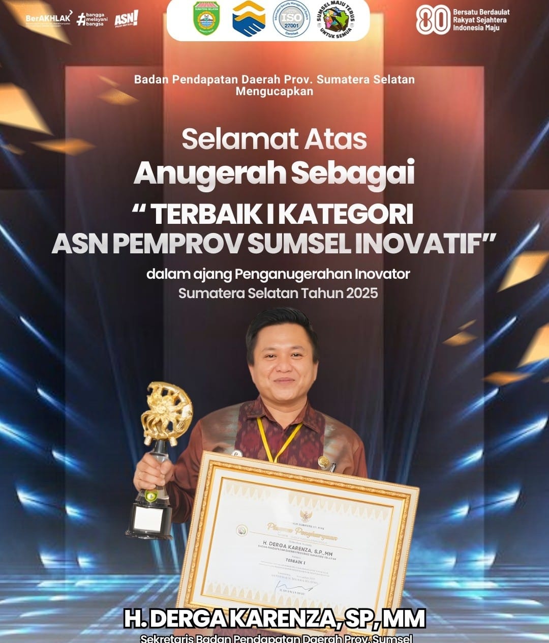 Salah satu penghargaan paling bergengsi pada malam itu diraih oleh Sekretaris Badan Pendapatan Daerah (Bapenda) Sumatera Selatan, H. Derga Karenza, S.P., M.M., yang dinobatkan sebagai Terbaik I Pemilihan Inovator Provinsi Sumsel Tahun 2025 untuk Kategori ASN Pemerintah Provinsi Sumsel Inovatif.