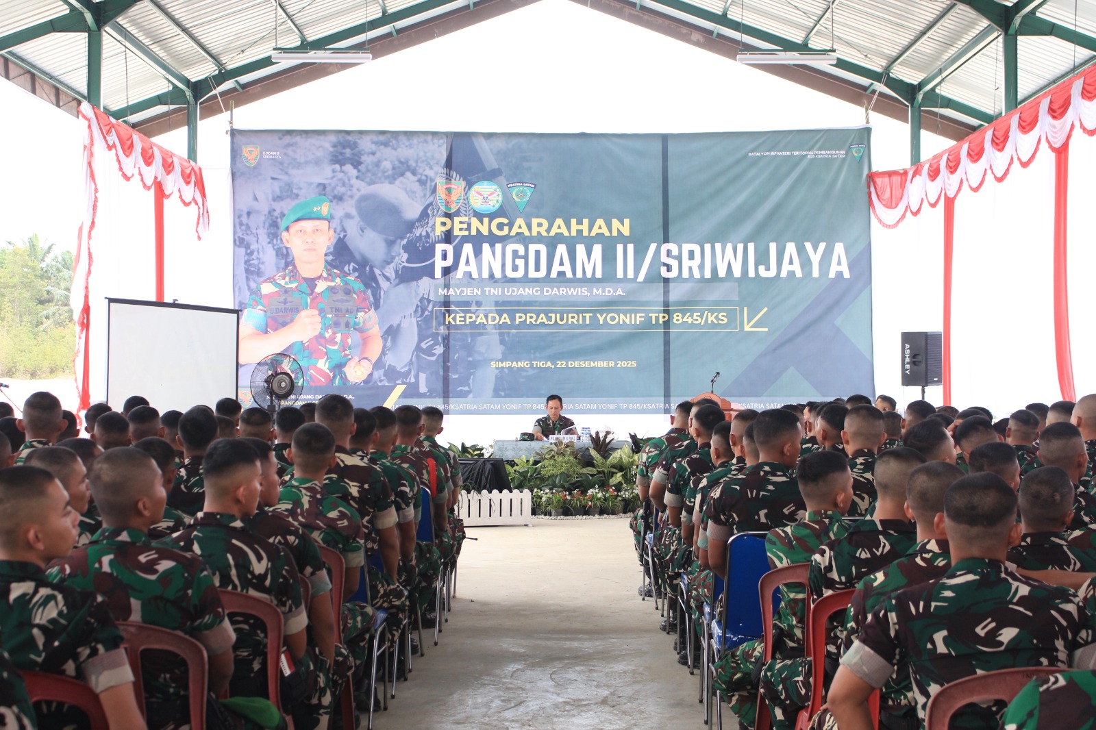 Wartainsumsel.com | Palembang – Panglima Komando Daerah Militer (Pangdam) II/Sriwijaya, Mayjen TNI Ujang Darwis, M.D.A., didampingi Ketua Persit Kartika Chandra Kirana Daerah II/Sriwijaya Ny. Desi Ujang Darwis, melaksanakan kunjungan kerja ke Batalyon Infanteri Teritorial Pembangunan 845/Ksatria Satam yang berlokasi di Simpang Tiga, Kecamatan Simpang Renggiang, Kabupaten Belitung Timur, Provinsi Kepulauan Bangka Belitung, Senin (22/12/2025). Kunjungan kerja tersebut bertujuan untuk memberikan motivasi, arahan, serta pembinaan kepada para prajurit Yonif TP 845/Ksatria Satam.